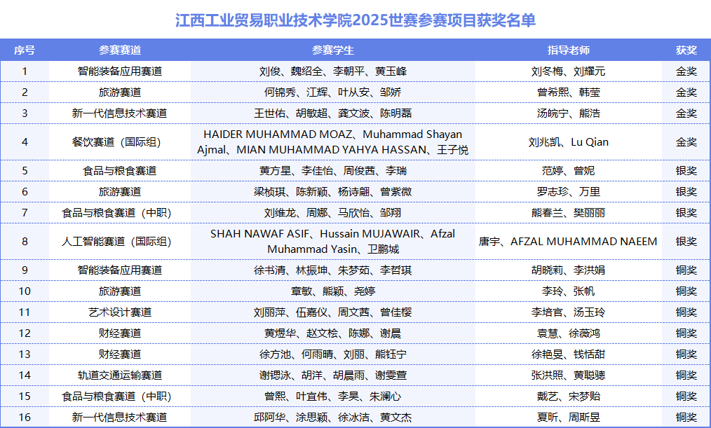 近日,2025年世界职业院校技能大赛总决赛争夺赛成绩揭晓。江西工业贸易职业技术学院代表队奋勇拼搏、表现卓越,一举斩获4枚金牌、4枚银牌和8枚铜牌,其中,由学院教师推荐并指导的留学生团队获得餐饮赛道(国际组)排位赛参赛资格,学院金牌数与奖牌总数再创历史新高,成绩位列全国职业院校第一方阵,充分彰显了“岗课赛证”融通育人模式下高素质技术技能人才培养的显著成效。