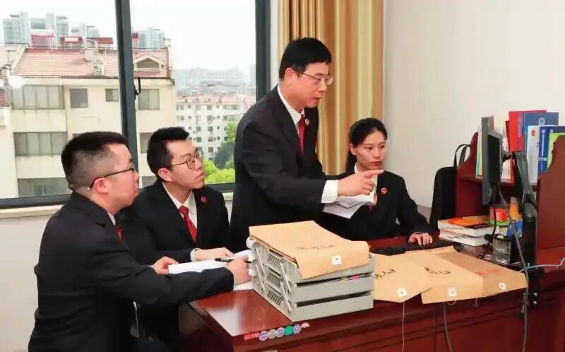 ▲九江市浔阳区人民检察院四级高级检察官饶建斌(区检察院原党组成员、副检察长,右二)积极发挥“传帮带”作用,指导年轻检察干部办理案件(2025年4月8日摄) 姚卫东摄