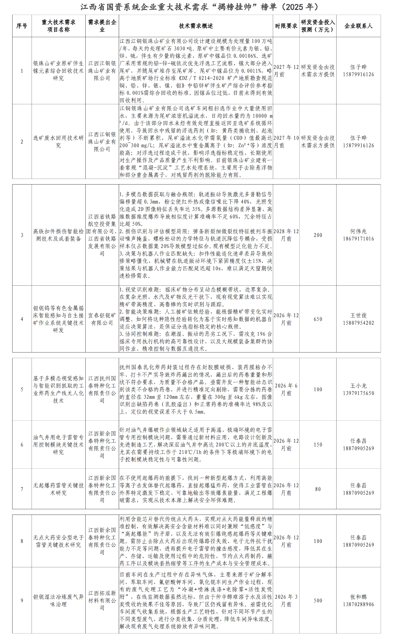 大江新闻讯 江西日报全媒体记者杨碧玉报道:江西江铜银珠山矿业有限公司每天约处理矿石3030吨,其中有少量的镓元素目前未得到有效回收利用,如何提升其综合回收技术?如何加强选矿废水回收技术研究,对其中的残留药剂加大脱除能力?……11月3日,记者从省国资委获悉,《江西省国资系统企业重大技术需求“揭榜挂帅”榜单(2025年)》(以下简称《榜单》)发布,涉及江铜集团等多家国企的9项重大技术需求难题,现诚邀各路“英雄”揭榜,协力解决制约企业发展的关键核心技术难题。