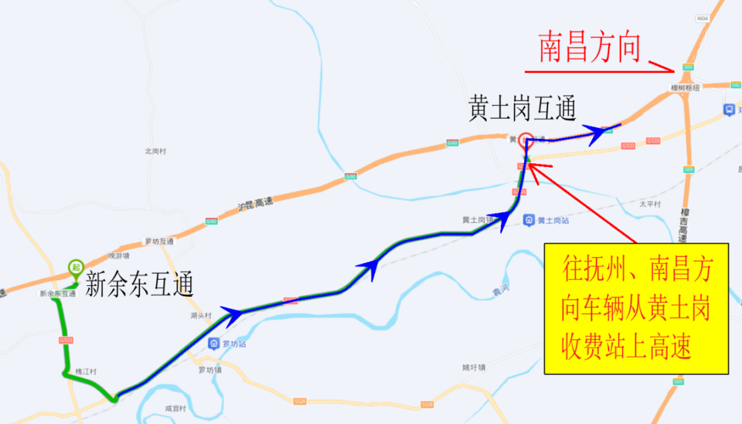 新余东(罗坊镇)→G533国道→G60沪昆高速黄土岗收费站上高速往抚州、南昌方向。