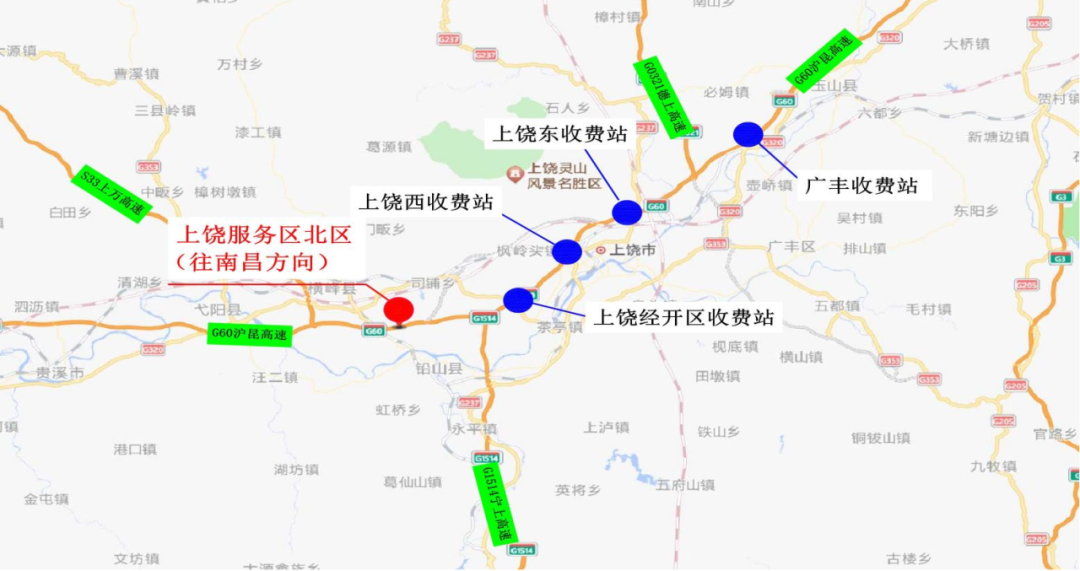 下高速:G60沪昆高速梨温段过往司乘人员请从广丰收费站、上饶东收费站、上饶西收费站、上饶经开区收费站下高速加油、充电、休息及车辆检修等。