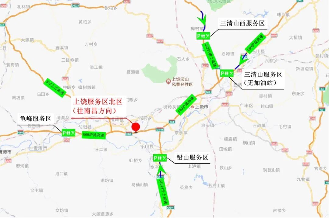 服务区:过往司乘人员可进入G60沪昆高速梨温段三清山服务区(无加油站)、G0321德上高速三清山西服务区、G1514宁上高速铅山服务区、G60沪昆高速龟峰服务区提前做好加油、充电、休息及车辆检修等。