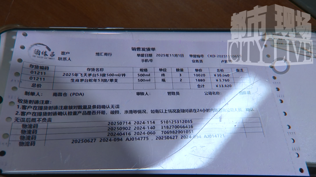 都市现场记者随后来到张女士买酒的商行,商行老板表示,三箱酒退回来时全都没有开封。此外,她向记者出示了这三箱53度茅台的进货单,均为“酒缘居名酒馆”发出。“开箱之后,我立刻叫来了酒缘居名酒馆的鉴定师现场进行了检验。”