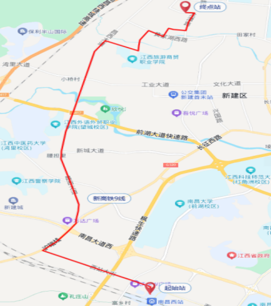 4.停靠站点:南昌西站、新建万达广场、昌西大道招贤大道口、丁香路南口、龙潭村、水仙路、江西电力职业技术学院西北门、南昌师范学院昌北校区南门;