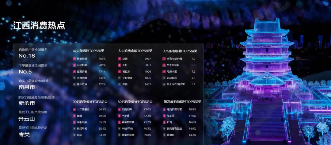 从成交额增速来看,数码与家电类商品表现尤为抢眼。数码相机以365%的增速高居榜首,运动相机紧随其后,增速达281%,显示出江西消费者对影像记录与户外生活方式的热情。此外,空调套装、药食同源类商品和陈年白酒也分别实现了134%、133%和124%的增长,反映出消费升级与健康理念的双重驱动。