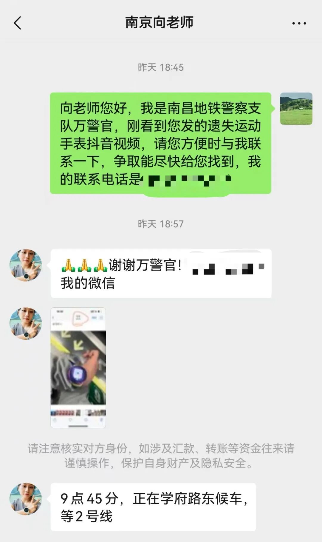 地铁警察支队民警与向女士取得联系