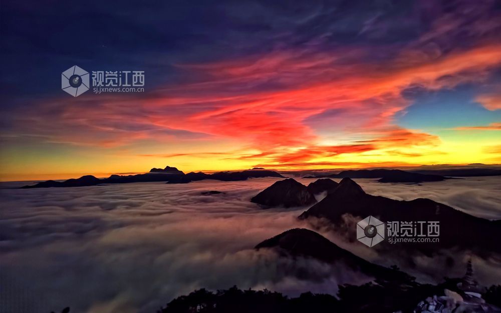 2025年11月10日傍晚,江西省遂川县与上犹交界的鹰盘山,日落云海奇观震撼上演。