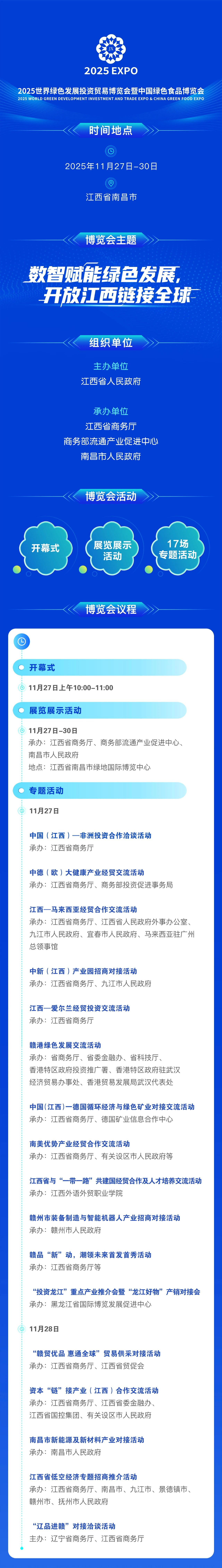 据了解,世界绿色发展投资贸易博览会由江西省人民政府主办,自2009年首届大会创办以来,始终坚持“绿色生态搭台、经贸合作唱戏”的办会思路,着力打造“论坛研讨、投资促进、贸易洽谈、展览展示”等于一体的多元化合作平台。