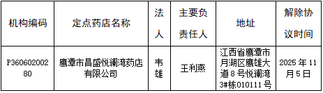 近期,鹰潭市医疗保险基金管理中心收到鹰潭市昌盛悦澜湾药店有限公司主动解除医保协议的申请,详见下表。协议解除后,其发生的购药费用基本医疗保险基金不再予以结算。