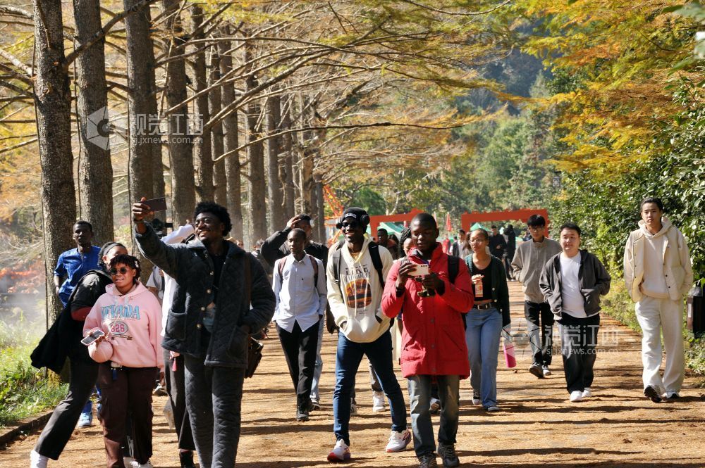 2025年11月15日,来自非洲的国外游客行走在江西省德兴市大茅山风景名胜区红杉大道上,开心地欣赏深秋红杉美景。