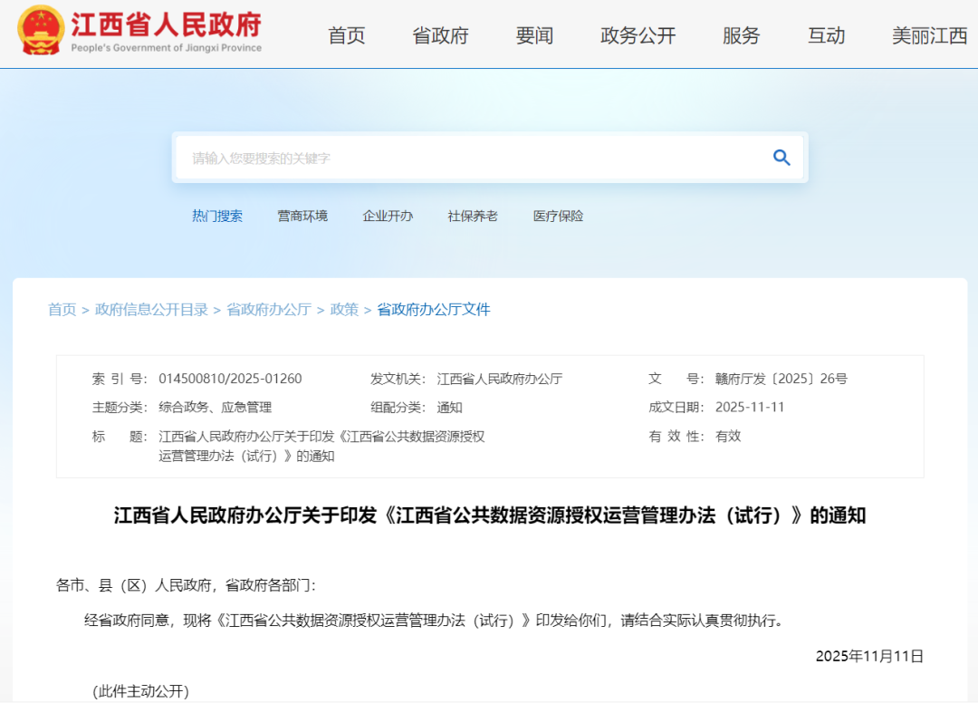 江西省人民政府办公厅关于印发《江西省公共数据资源授权运营管理办法(试行)》的通知