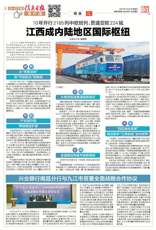 在上饶,今年5月投入使用的坑口铁路专用线,将货物运输时效从多式联运班列开行前的26小时缩短至12小时以内;在樟树,开出全国首列多式联运“一单制”班列,运输效率与成本优势显著;在九江,今年10月首开的“长江班列”绕过三峡船闸,较传统水运模式缩短运输时间约15天……今年前10个月,江西铁路累计发送货物4338.1万吨,多节点、多模式的协同网络正在形成。