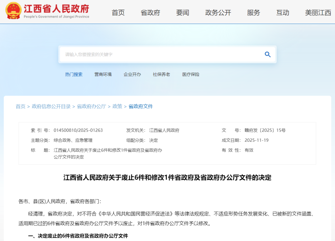 经清理,省政府决定,对不符合《中华人民共和国民营经济促进法》等法律法规规定、不适应形势任务发展变化、已被新的文件涵盖、适用期已过的6件省政府及省政府办公厅文件予以废止,对1件省政府办公厅文件予以修改。