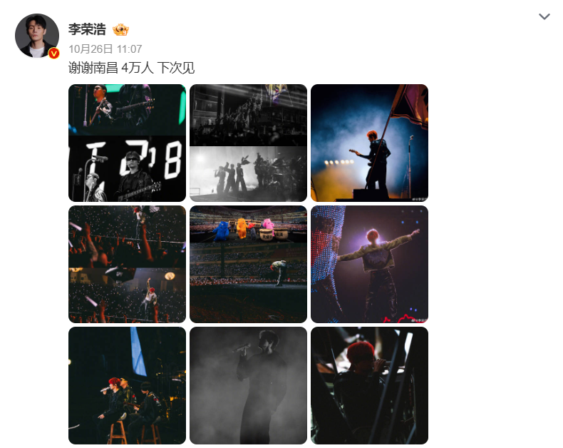10月25日,李荣浩「黑马」世界巡回演唱会-南昌站在南昌国际体育中心体育场开唱,李荣浩演出间隙多次提及南昌美食和赣江夜景、滕王阁等南昌地标。