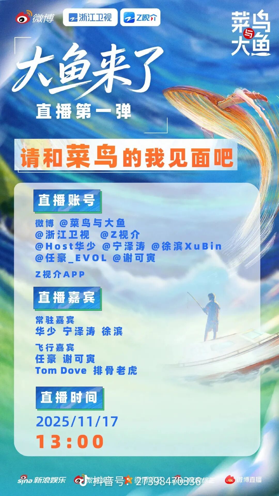 据悉,《菜鸟与大鱼》是一档聚焦垂钓群体的实验类纪实真人秀,常驻嘉宾华少、宁泽涛、徐滨将在节目中化身“钓鱼菜鸟”,潜入当地钓友群体,开启一场兼具趣味与深度的垂钓探索之旅。
