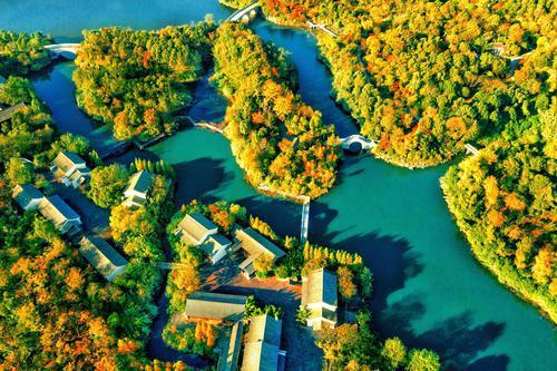 11月21日,萍乡湿地公园枫香、银杏、乌桕等泛黄浅红的树叶与湖水、观景桥相互映衬,构成一幅色彩斑斓的初冬生态画卷。特约通讯员 邓建萍摄