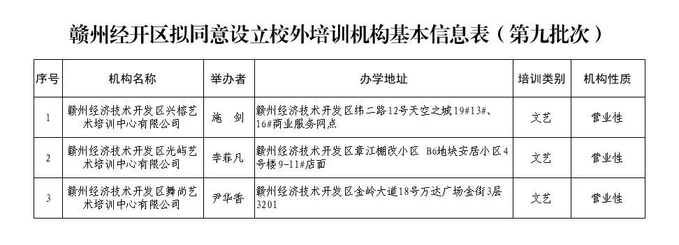 附件:赣州经开区拟同意设立校外培训机构基本信息表(第九批次)