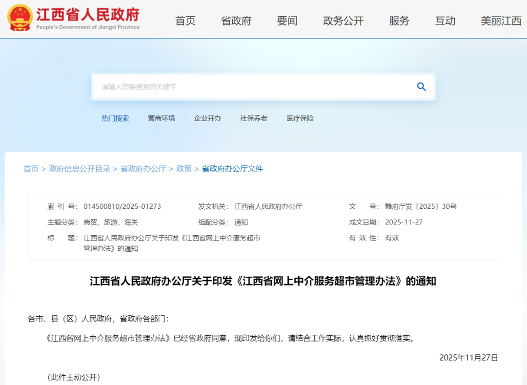 江西省人民政府办公厅关于印发《江西省网上中介服务超市管理办法》的通知
