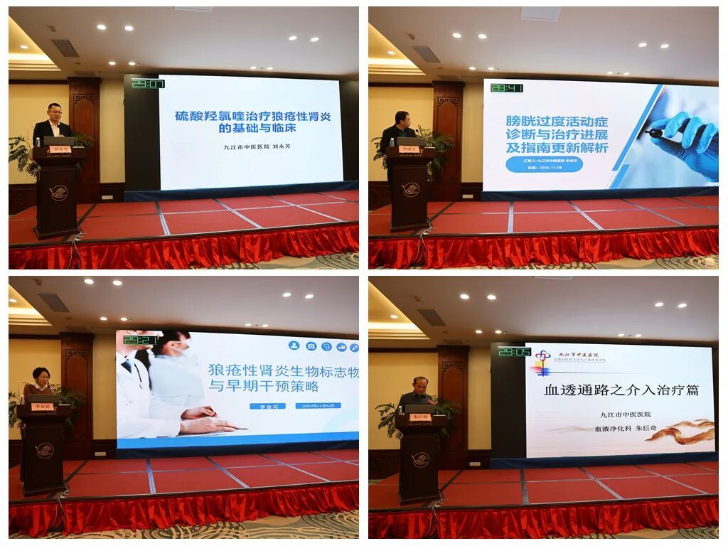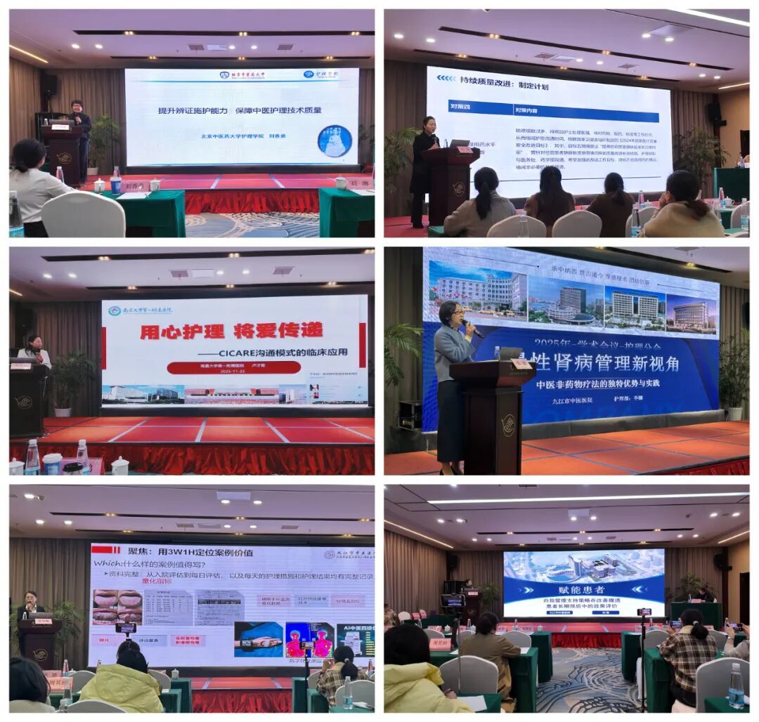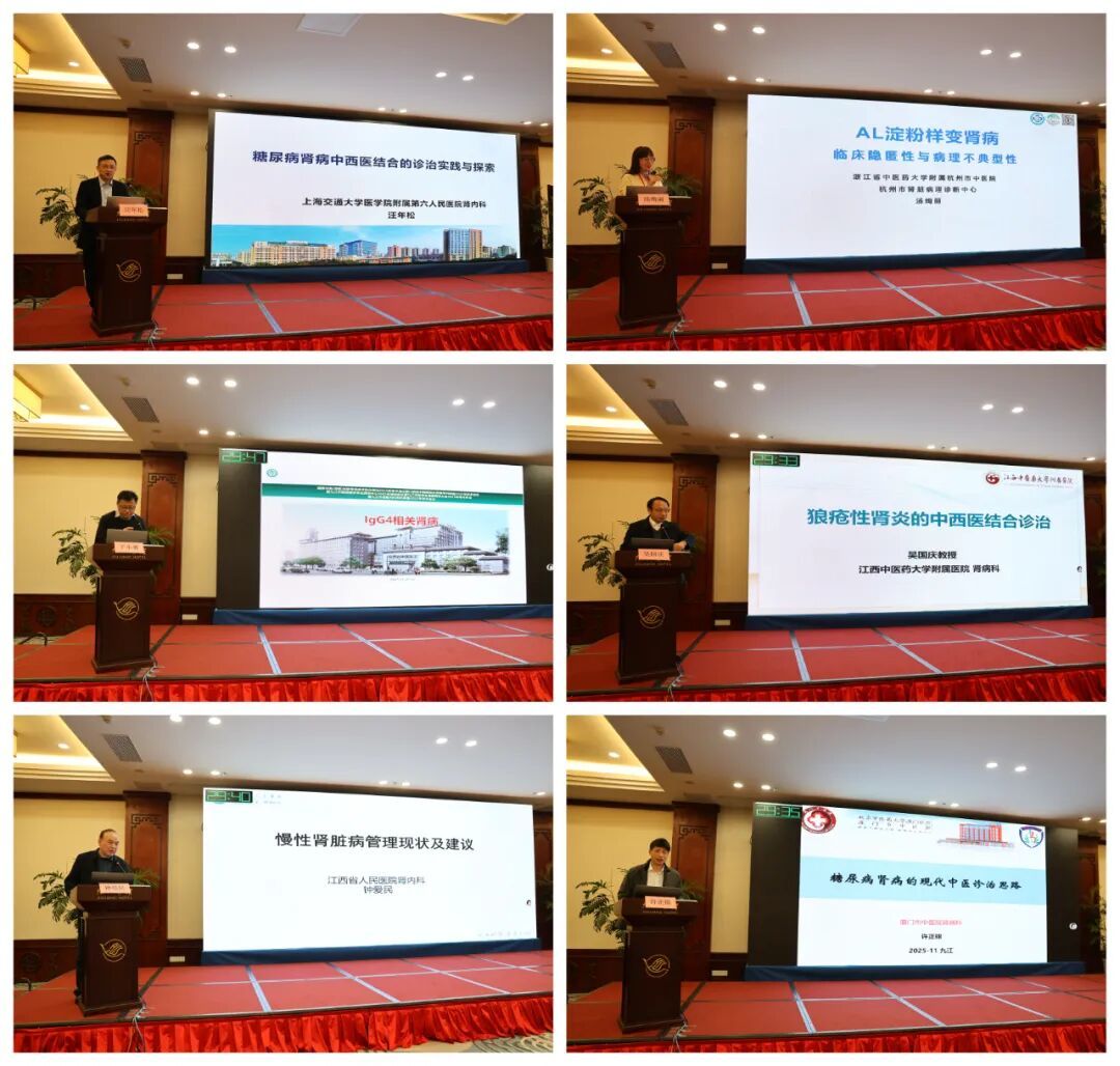 本次会议群贤毕至,邀请了上海交通大学附属第六人民医院汪年松、上海中医药大学附属龙华医院方邦江、北京中医药大学护理学院刘香弟、南方医科大学南方医院李爱青、广东省中医院卢富华、陕西省中医院于小勇、杭州市中医院汤绚丽、厦门市中医院许正锦、江西省人民医院钟爱民和刘琳、南昌大学第二附属医院徐承云、江西省中医院吴国庆、南昌大学第一附属医院卢才菊、赣南医科大学第一附属医院李小生等众多省内外知名专家,以及九江市中医医院刘永芳、黄红恩、李娜、朱巨奇、李成文、李金花、肾病医院各护士长等,围绕肾脏病学的中西医结合诊疗新进展、专科技术协作创新、医疗质量管理提升、临床科研深度融合、肾脏病护理等核心议题,开展了精彩的学术分享,多维度呈现中西医肾病前沿领域的最新进展。各位专家学者探颐索隐,精彩纷呈,参会人员潜心贯注、凝神谛听,思想碰撞迸发创新之火,薪火相传点燃学术之光。