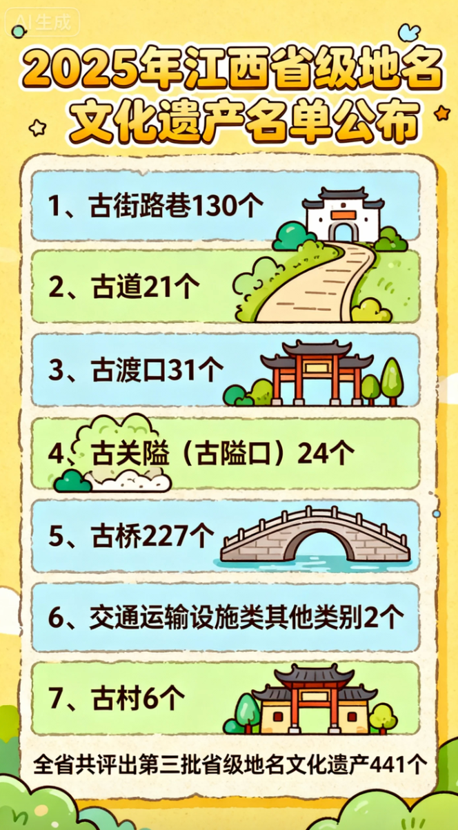 昨天,2025年江西省级地名文化遗产名单正式公布,共评出第三批省级地名文化遗产441个,其中古街路巷130个,古道21个,古渡口31个,古关隘(古隘口)24个,古桥227个,另有交通运输设施类其他类别2个,古村6个。