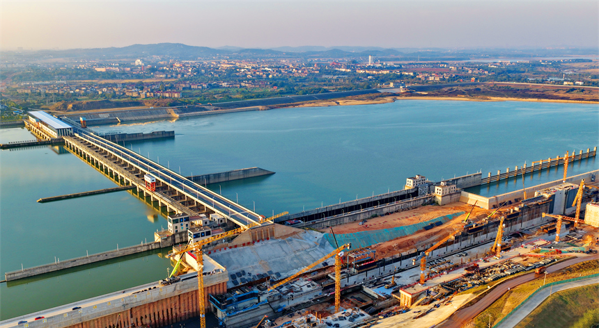 近日,位于丰城市的赣江龙头山枢纽塔吊林立,工人在加紧建设水利枢纽二线船闸。连日来,该市抢抓冬季枯水期的有利时机,有序推进排涝泵站、涵闸船闸、堤防加固等水利工程项目建设,进一步提升山塘水库、河道湖泊灌溉能力,助力农业增产增收。 (朱海鹏 摄)