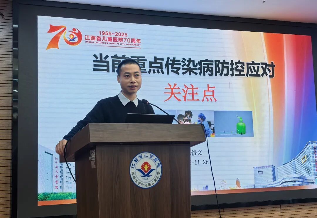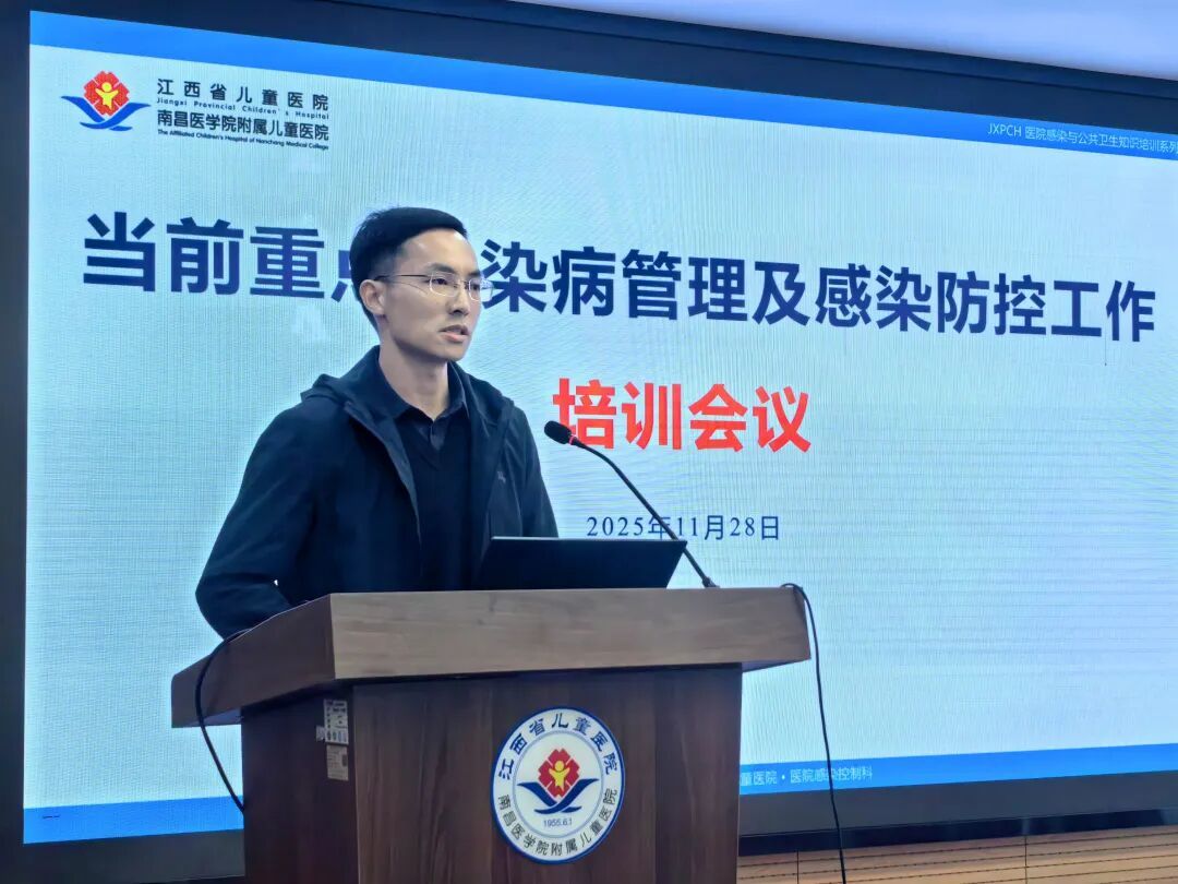 为积极应对冬春季重点传染病,进一步提升医务人员感染防控能力,有效保障妇幼及医务人员身体健康与生命安全,11月28日,江西省儿童医院感染控制科举办重点传染病防控培训会议。医院党委委员、公共卫生首席专家陈修文出席会议并对相关工作进行了强调和部署,感染控制科副科长谢承峰主持。来自江西省儿童医院和江西省妇幼保健院共150余名医护人员参加了本次培训会议。