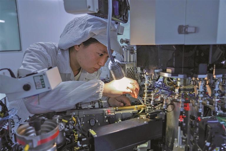 日前,在位于德兴市高新技术产业园区的德芯科技有限公司车间内,工人正在半导体封装测试生产线上忙碌,保证订单供应,冲刺四季度。德芯科技有限公司年产封装60亿颗芯片,主营半导体集成电路、智能控制模块、光电及电子通信产品。 詹求昊 摄