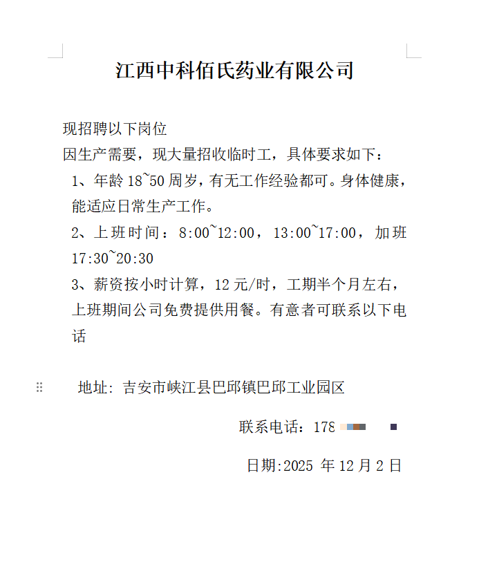 经查,帖文中涉事用人单位为江西中科佰氏药业有限公司,因季节性用工需求,公司向外发布了招工信息,用工方式为全日制用工,每天工作8小时,有加班的按加班工资另行支付,公司为方便计算薪酬,当时在发布招工信息时也是按当地最低月工资标准(1950元/月÷20.67/天÷8小时≈11.8元/小时)核算出来的小时工资向外发布了招工信息。