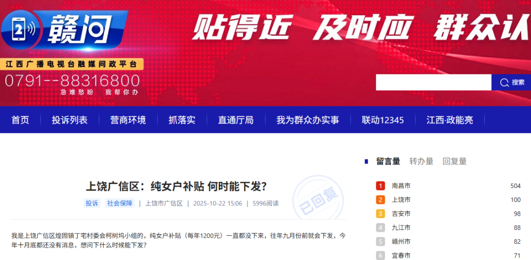 《赣问》平台转来的《上饶广信区:纯女户补贴 何时能下发?》已收悉。