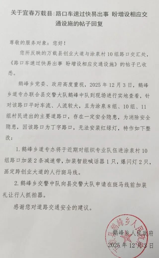 《赣问》平台转来的《宜春万载县:路口车速过快易出事 盼增设相应交通设施》已收悉。