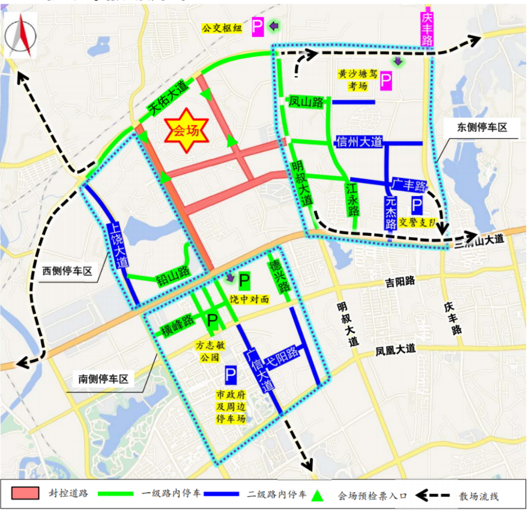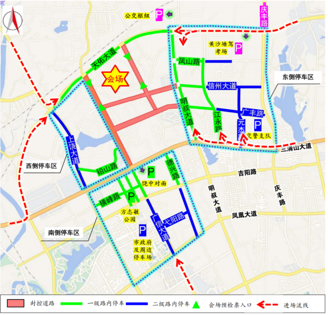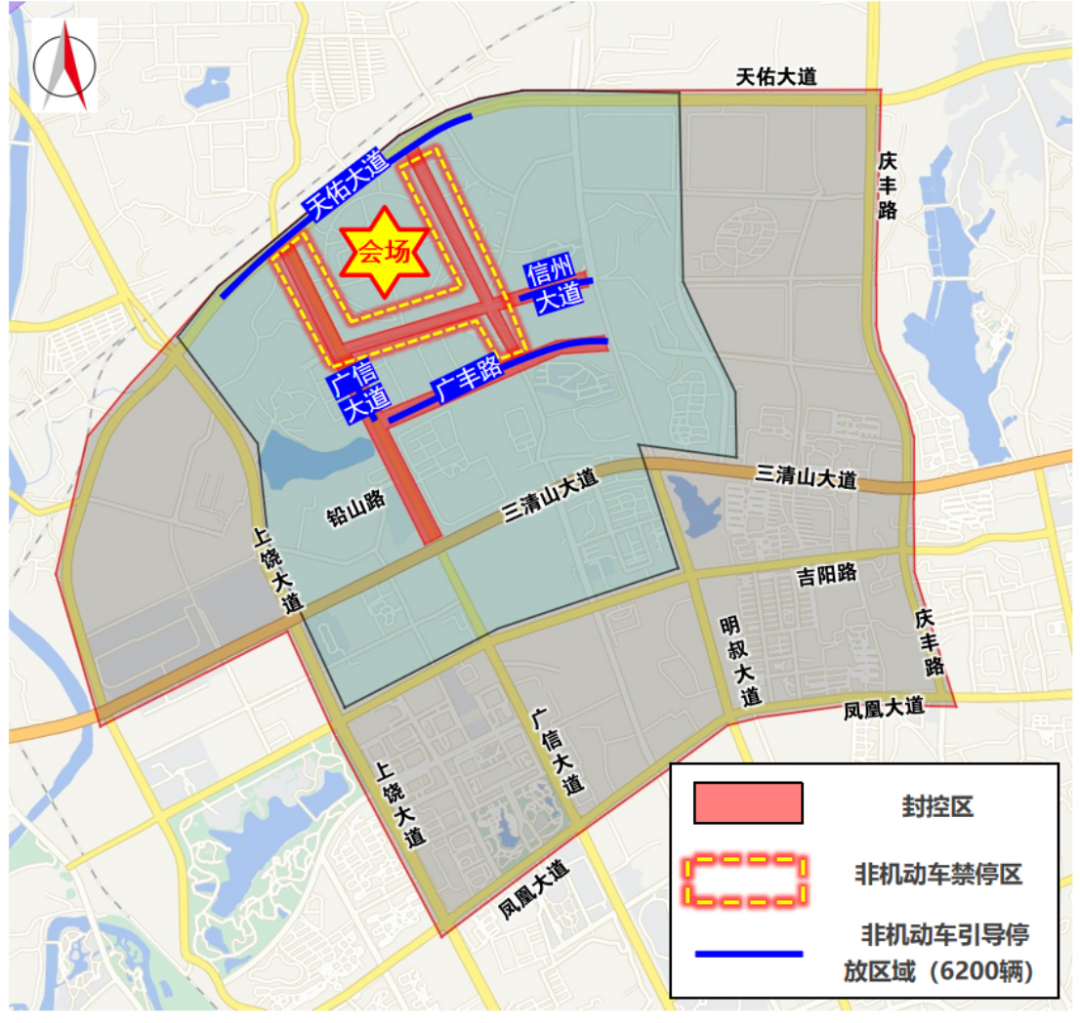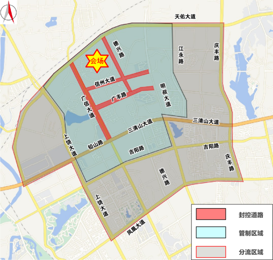 演唱会期间封控道路禁止通行,管控区域建议过往车辆绕行:东互通东向西方向车流建议通过稼轩大道→凤凰大道→上饶大道绕行;