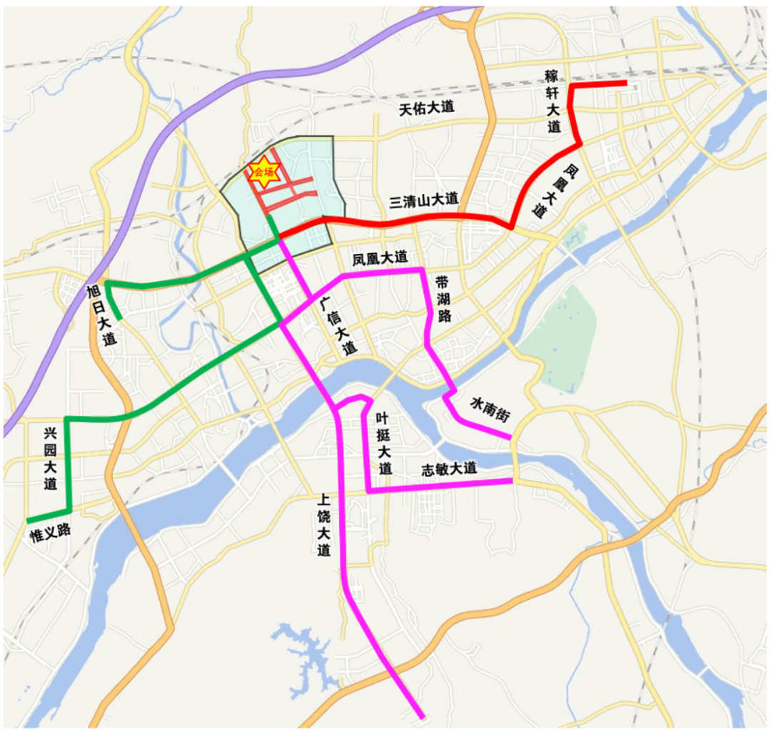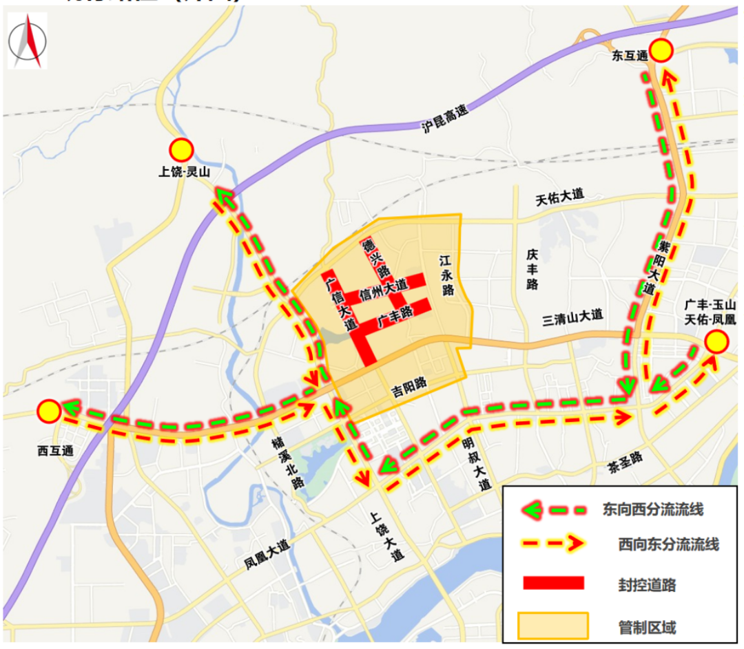 西互通西向东车辆建议通过上饶大道→凤凰大道→稼轩大道绕行广丰/玉山驶入市区车辆建议通过凤凰大道→上饶大道→三清山大道绕行