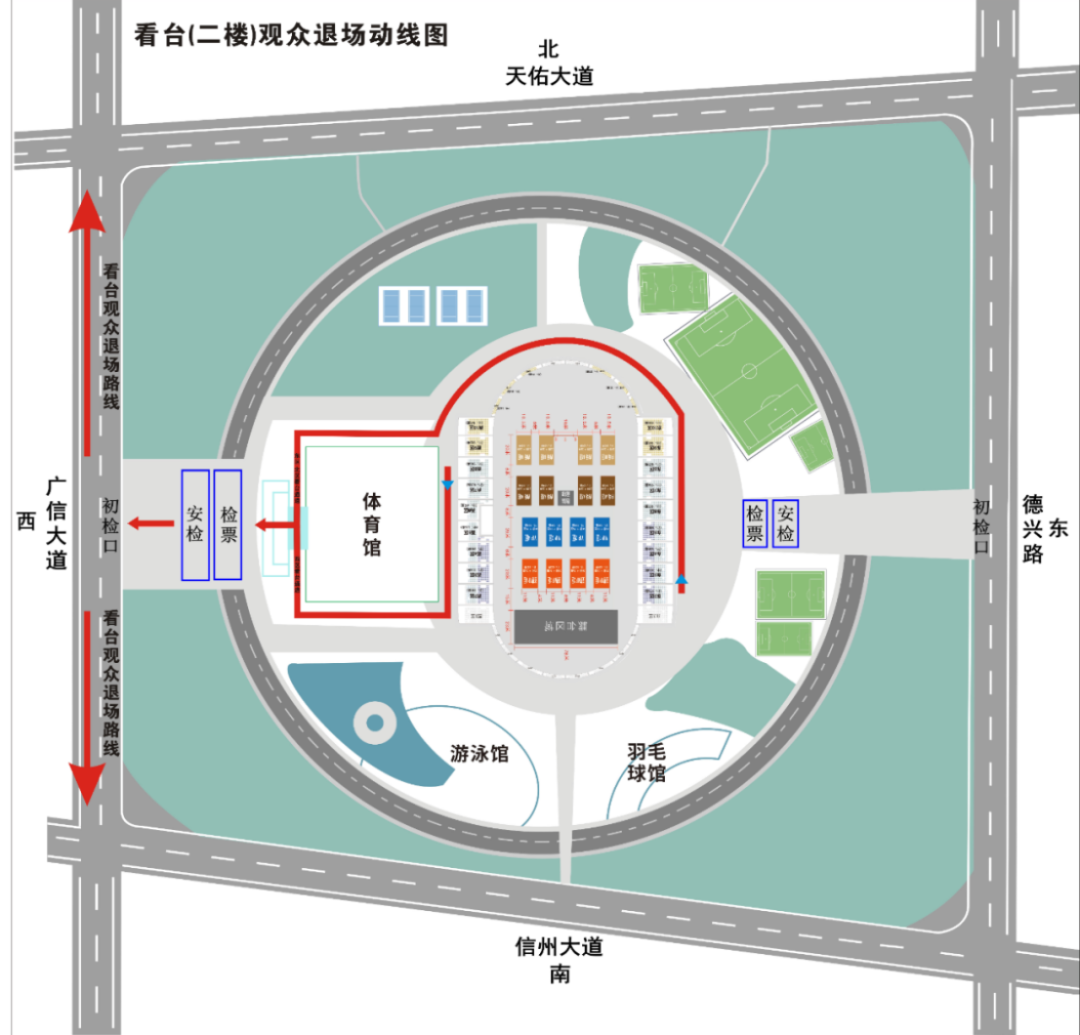 看台区(二楼:东区、西区、北区)观众,必须从西入口进入。