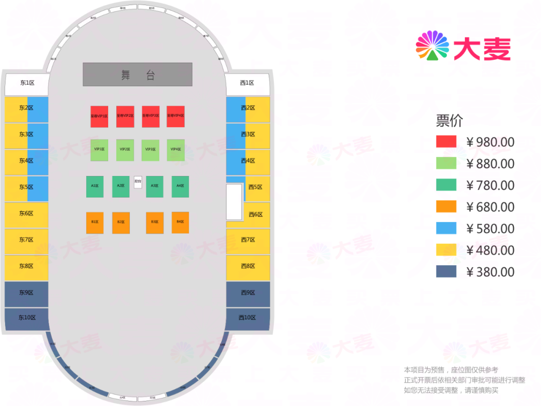 内场区(一楼:至尊VIP区、VIP区、A区、B区)观众,必须从东入口进入。