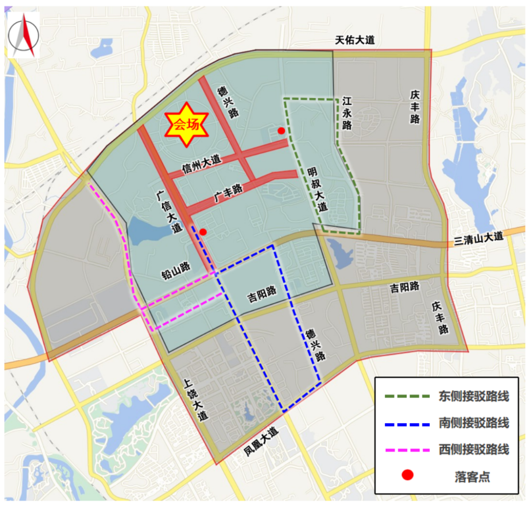 北方向通过上饶大道→天佑大道进场,停放于天佑大道及西侧停车区。