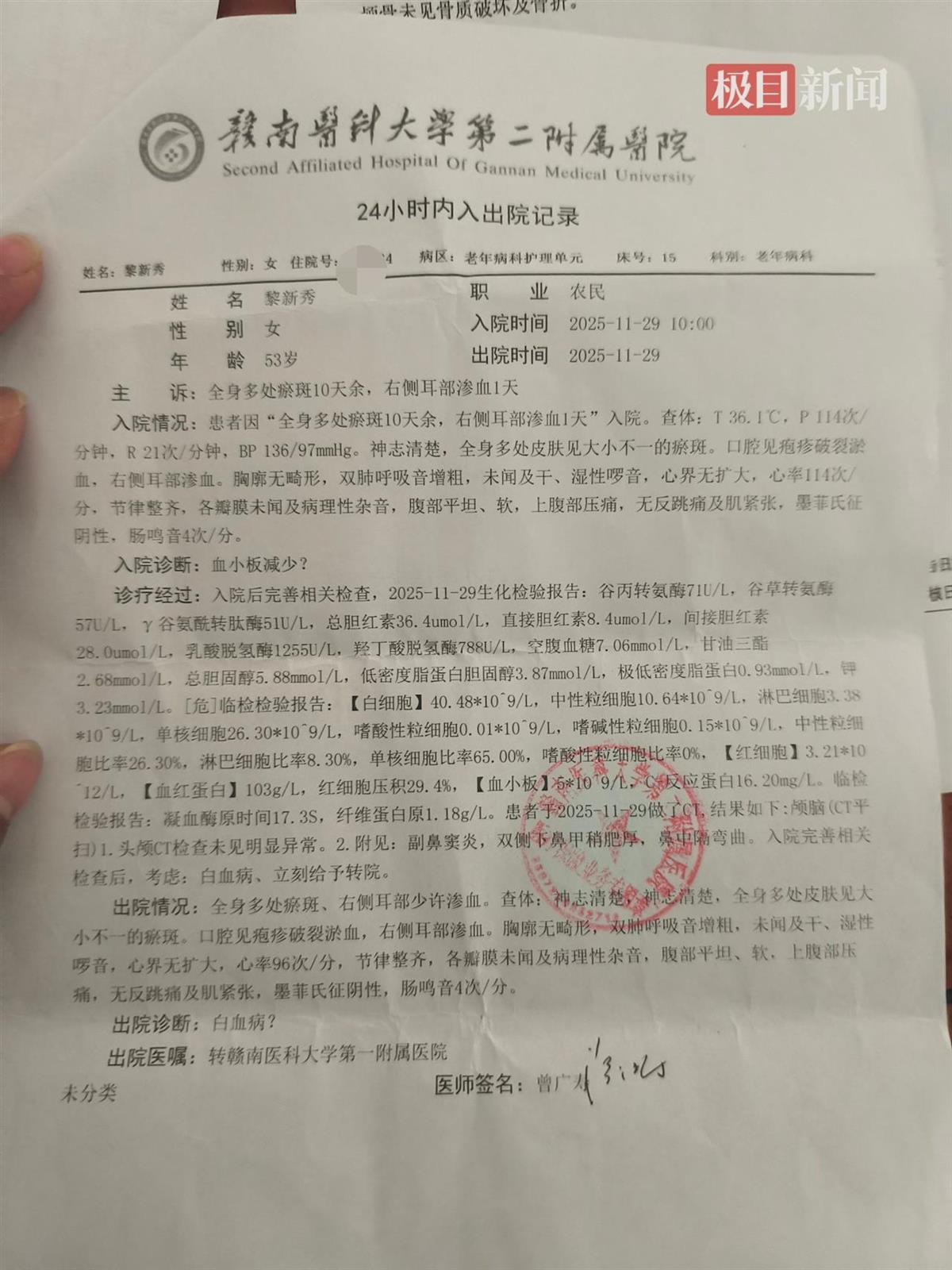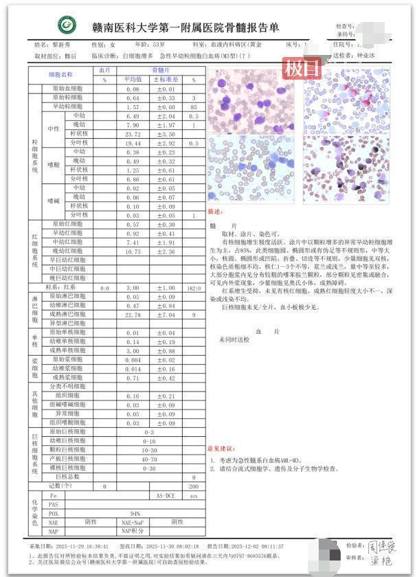 吴起旺提供的就诊记录显示,11月29日其母亲黎新秀在赣南医科大学第二附属医院入院时,全身皮肤可见多处大小不一的瘀斑,口腔内伴有疱疹破裂后的淤血,右侧耳部也有渗血现象,出院诊断为“白血病”。12月2日,赣南医科大学第一附属医院的骨髓报告单进一步明确其临床诊断为“急性早幼粒细胞白血病(M3型)”。