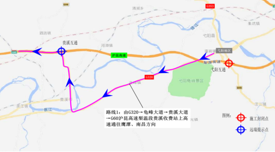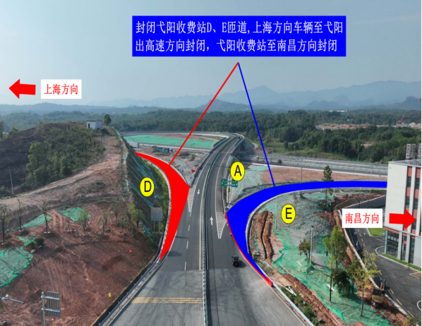 封闭弋阳互通D、E匝道,上海方向来车下弋阳收费站及弋阳收费站上高速前往南昌方向的车辆禁止通行。
