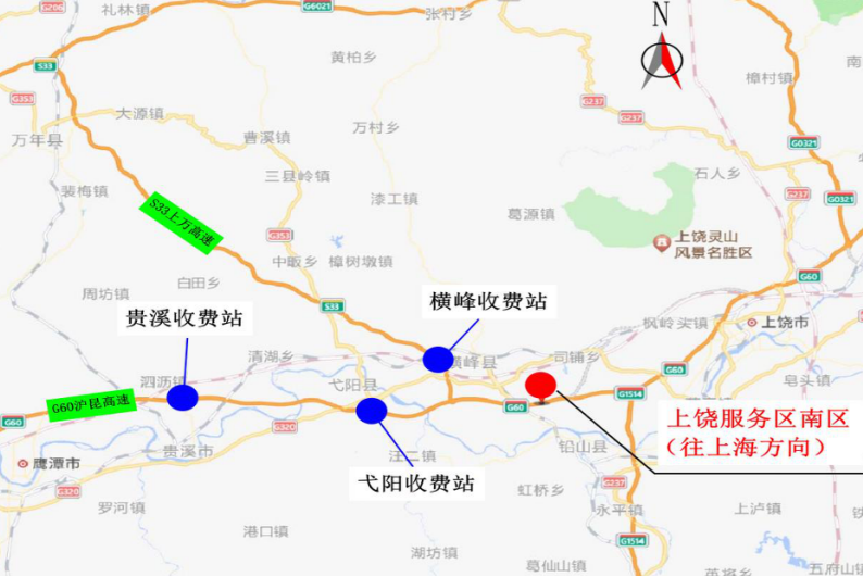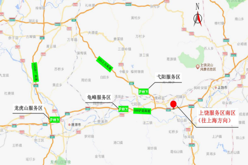 服务区:过往司乘人员可进入S33上万高速弋阳服务区、G60沪昆高速梨温段龙虎山服务区、龟峰服务区提前做好加油、充电、休息及车辆检修等。