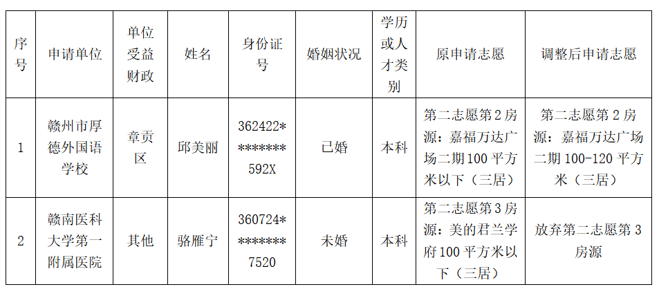 根据《关于开展市中心城区第十批次新建和配建人才住房申请分配工作的通知》要求,2025年12月4日—8日,赣州市城市住房服务中心发布了《市中心城区第十批次新建和配建人才住房申请审核合格家庭情况公示》。经公示并核实,现就有关调整说明如下: