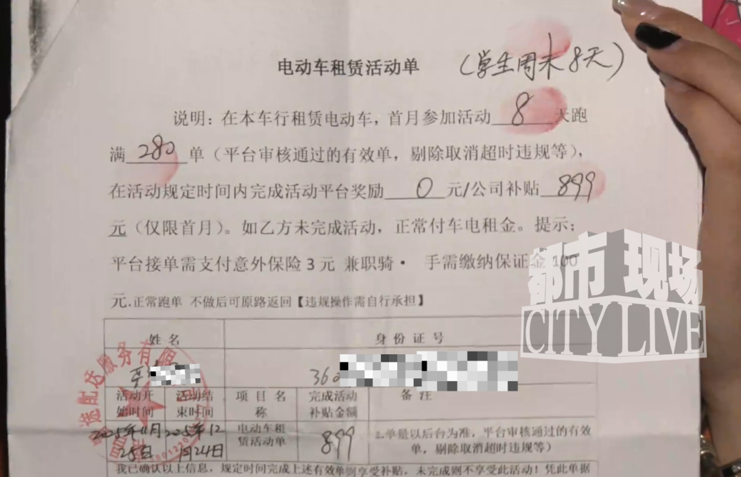 小严回忆:“对方(招聘人员)说有时间就做就行,首月电动车免费给我用,接着拿合同让我签字按手印,还拿走我的手机绑定支付宝‘拍小租’,要办三个月租车手续。我跟她说只干一个月,她称都是这样,必须绑定三个月,还说‘可以不干了随时解绑’,我就没多想。”
