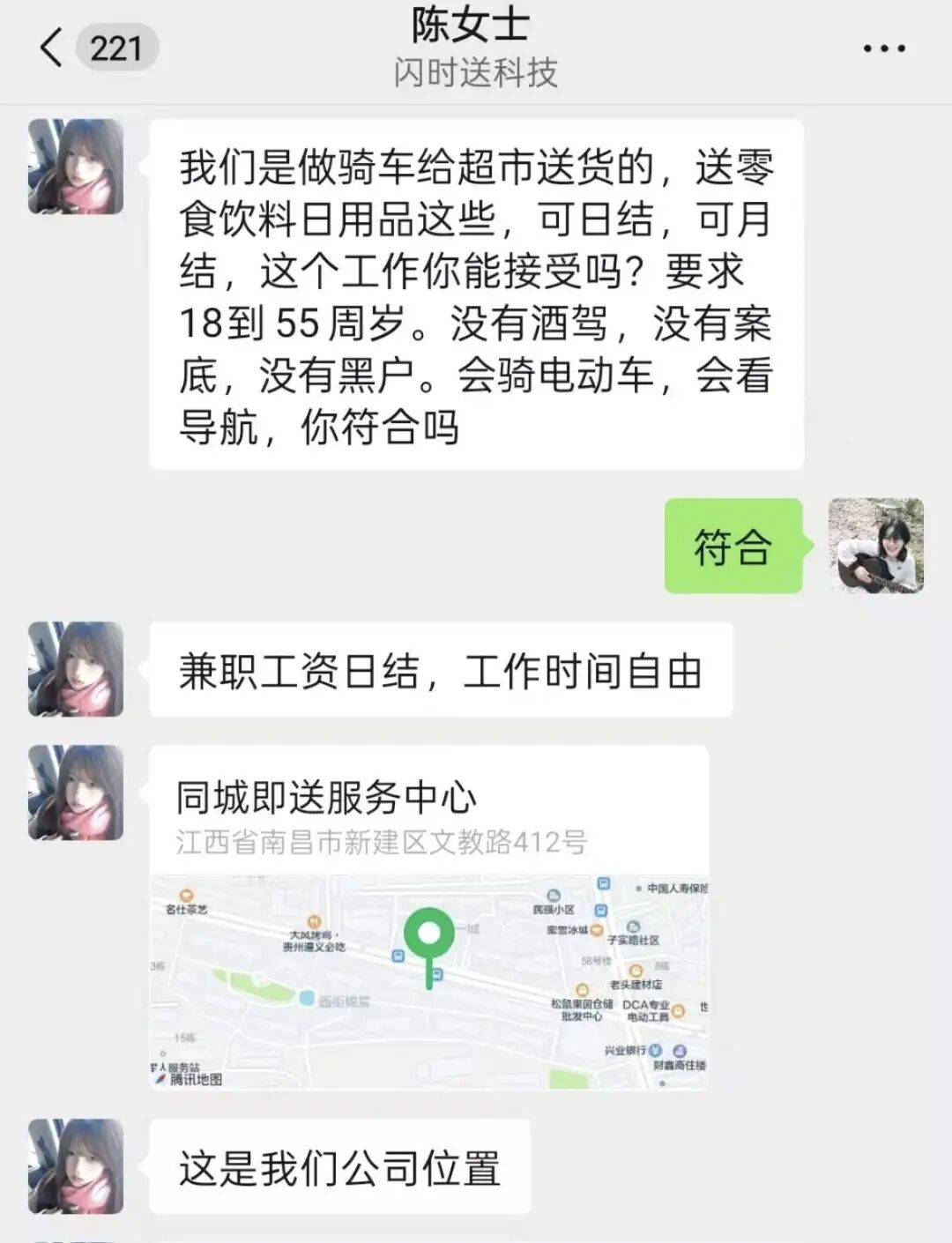 心动之下,小严立即投递简历并很快收到面试邀约,按地址前往南昌市新建区文教路412号的“同城即送服务中心”,该地点门头同时显示为智途配送有限公司。