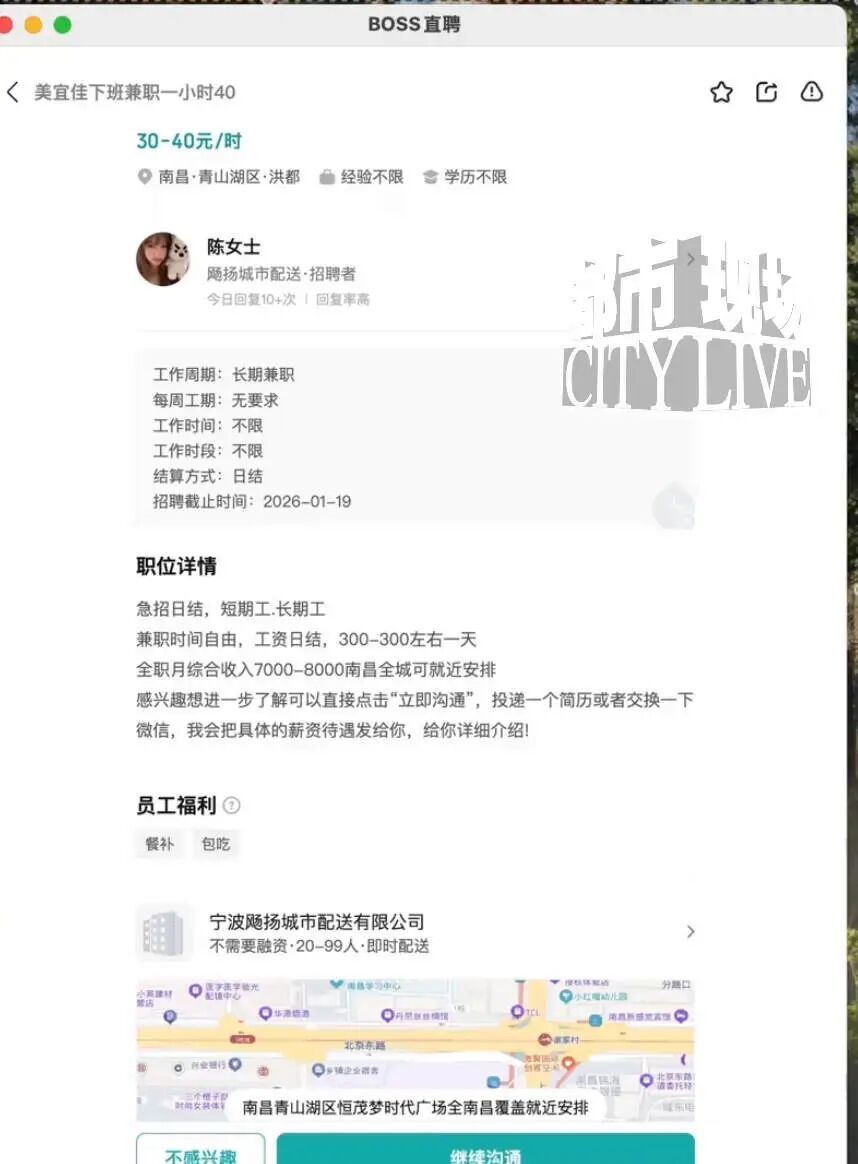 工作人员向记者描绘,即便工作时不用全力投入、只是偶尔兼职,每天花四五个小时跑单,一个月也能赚到5000元左右。当记者确认是否需要日均跑30单时,对方表示30多单的工作量并不算大,公司里很多女性求职者每天都能完成四五十单。