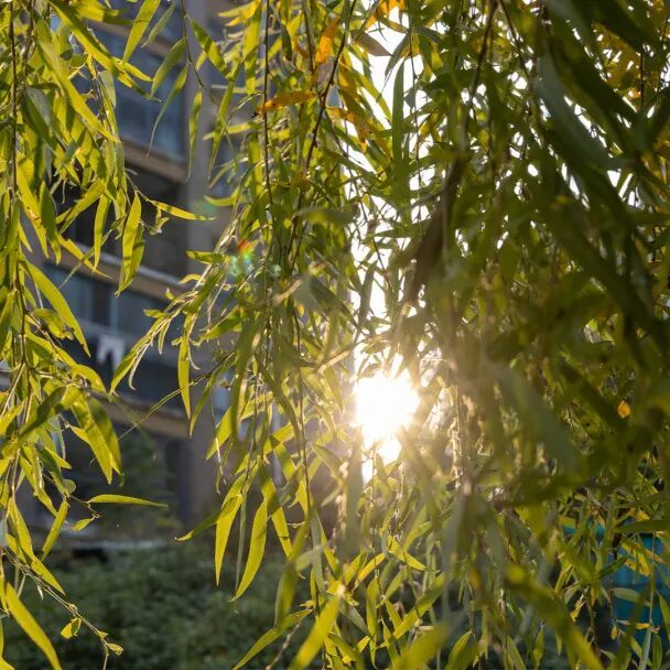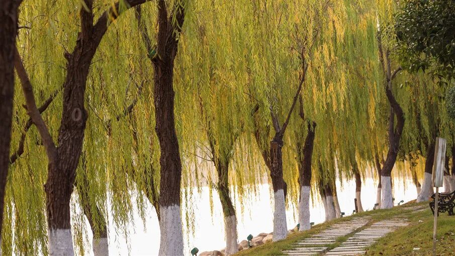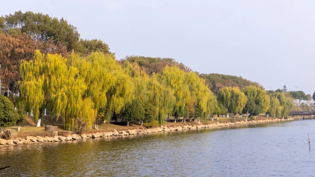 仔细看——柳叶竟染上了一层淡淡的金黄,在阳光下闪着细碎的光。微风拂过,柳枝轻点湖面,漾开一圈圈涟漪,仿佛在书写冬日的诗意。