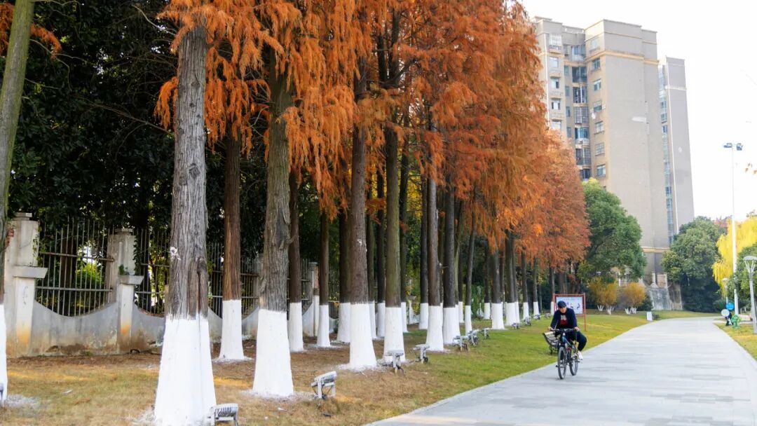 在公园另一头藏着一片杉树林。笔直的树干划向天空,羽毛状的叶片已转为锈红与棕褐。阳光斜射时,林间光影斑驳,宛如走进一幅静谧的古典油画。