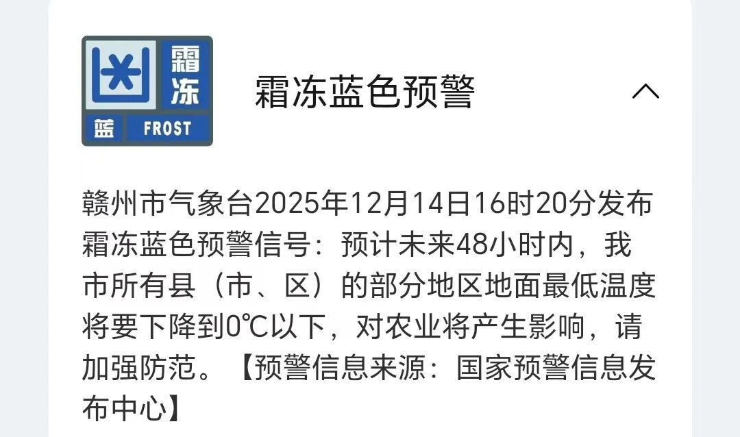 大江新闻讯 全媒体记者肖立宇报道:赣州市气象台于12月14日16时20分发布霜冻蓝色预警信号。预计未来48小时内,赣州所有县(市、区)的部分地区地面最低温度将下降到0℃以下,对农业将产生影响。