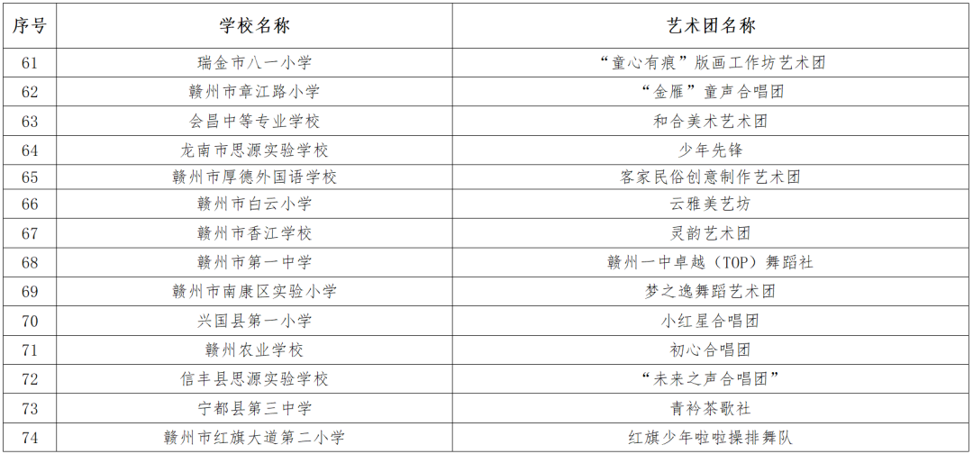 根据《关于开展全国示范性学生艺术团申报遴选工作的通知》安排,近期,省教育厅组织专家采取线上方式,对246个学生艺术团的申报材料进行了评审,按得分由高到低的顺序,评选出192个艺术团,拟报教育部遴选认定。其中,赣州34所学校艺术团拟推荐,正在公示,一起来看——
