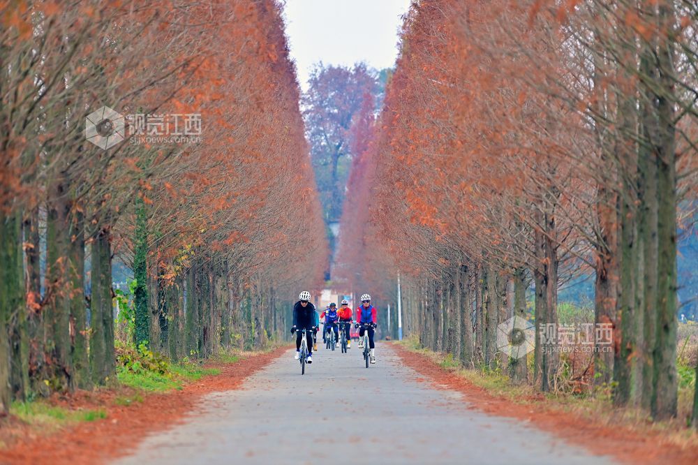 近日,江西省宜春市万载县三兴镇三兴村乡村道路两旁的水杉树在阳光的照耀下格外红艳,吸引了骑行爱好者及游客前来打卡。图为2025年12月18日,骑行爱好者在江西省宜春市万载县三兴镇三兴村的水杉乡道上骑行。 视觉江西 邓龙华 摄