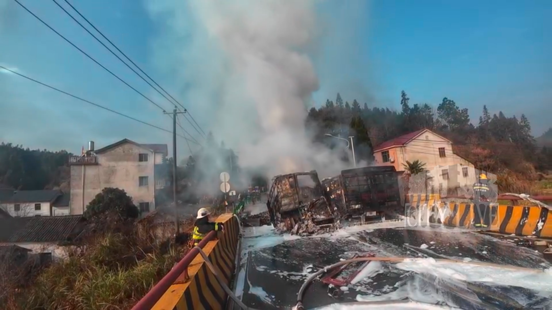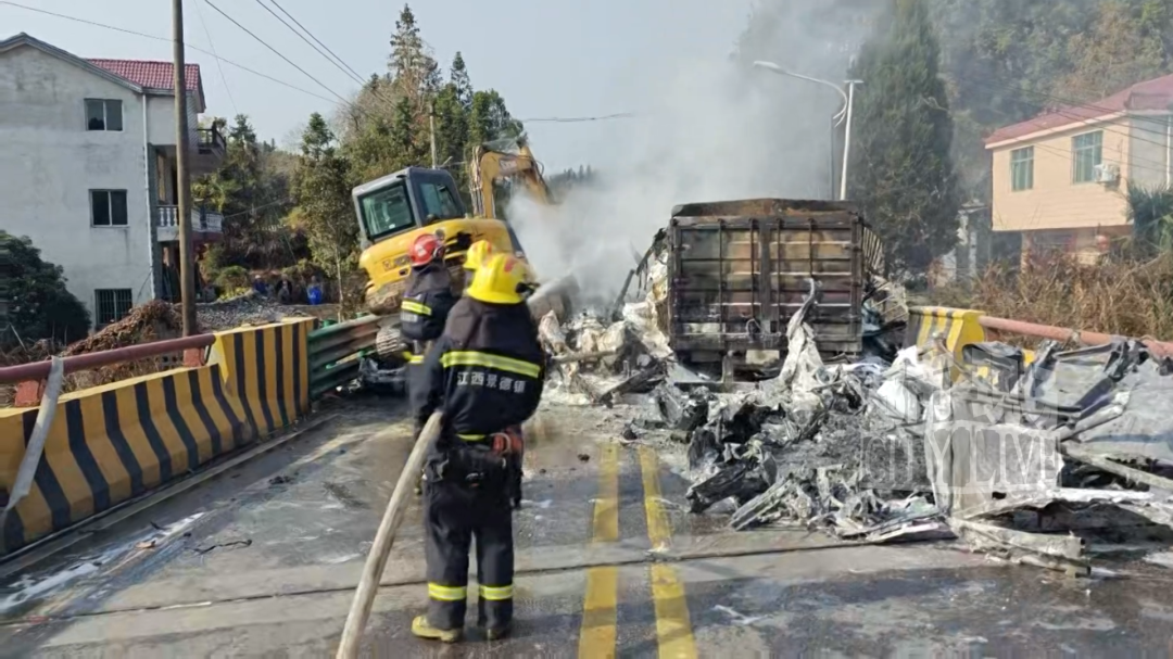 事故发生在当天早上7点多,两辆半挂车在行驶过程中发生碰撞,随后车辆起火。“村民说当时两名司机均被困在驾驶室中,且无自救能力,随后热心的村民立即对两名被困司机进行了解救,解救出来后,车辆迅速发生燃烧。”景德镇浮梁县消防救援大队椿年街消防救援站消防员邵明轩向都市现场记者介绍道。