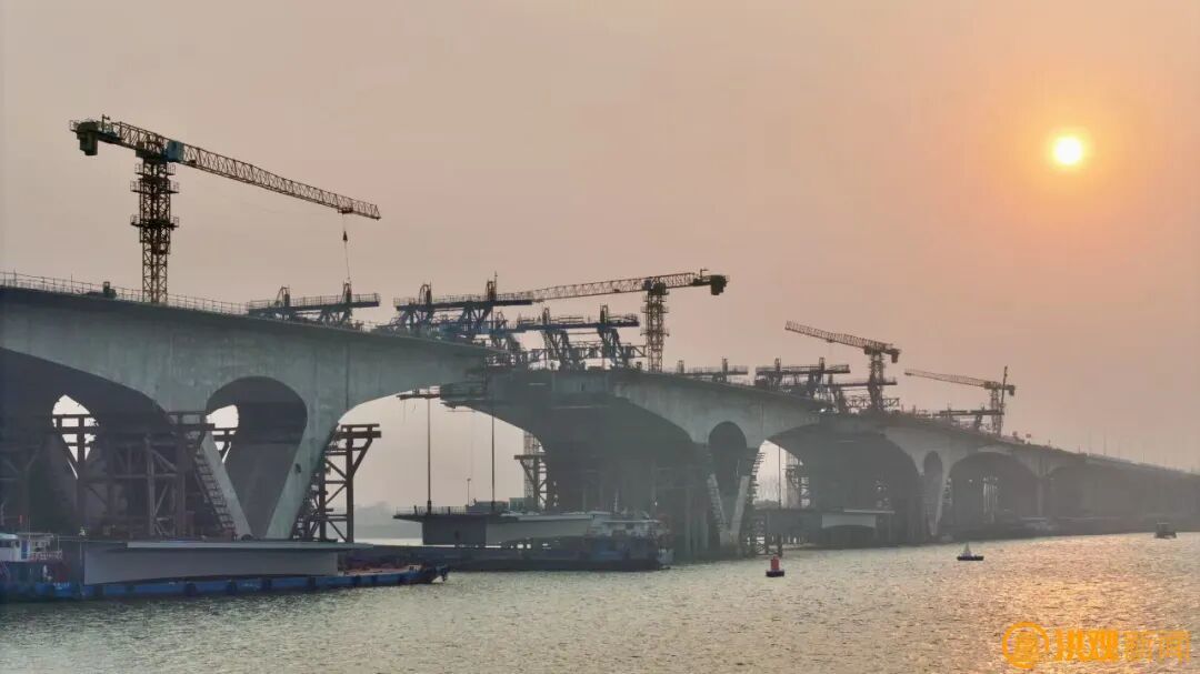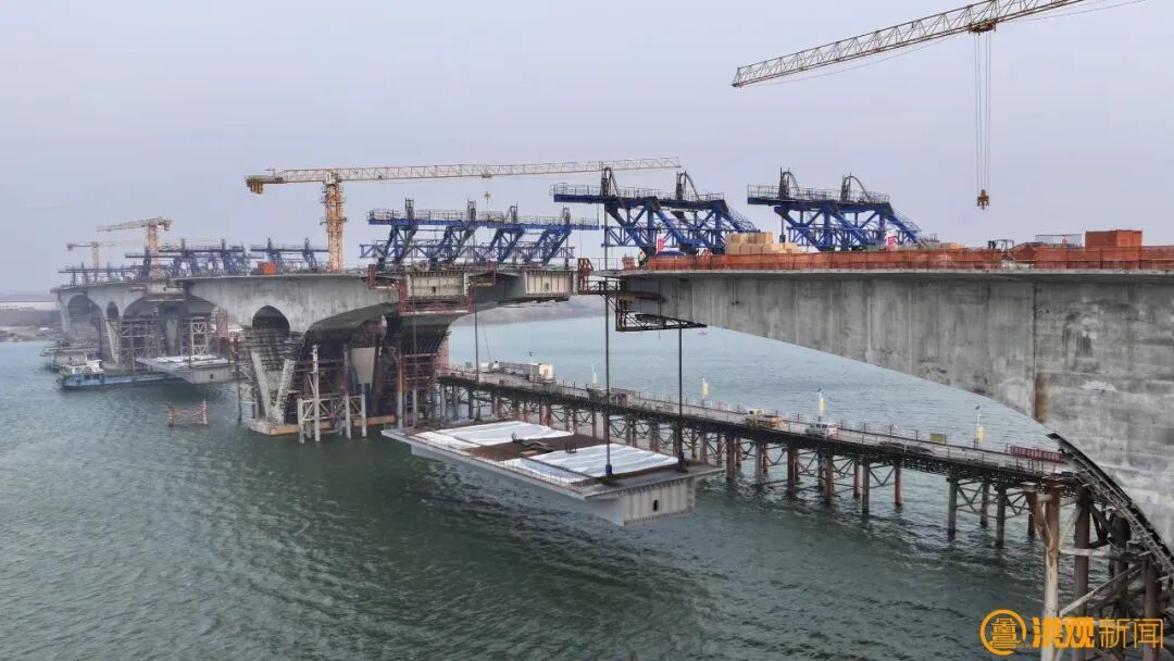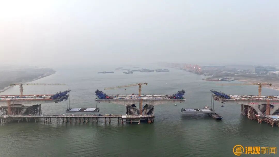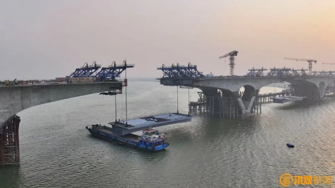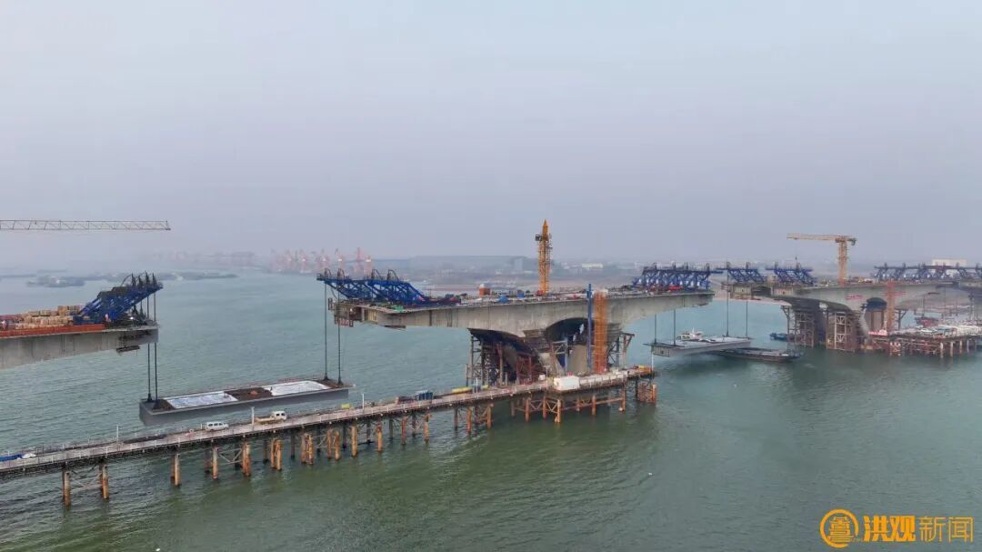 施工方正在进行大桥右幅中跨