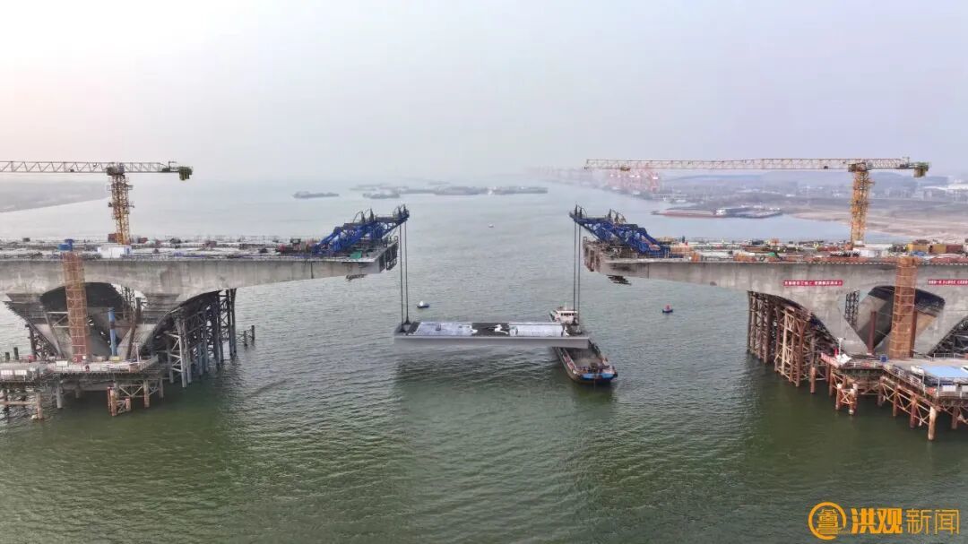 和次边跨钢箱梁同步吊装。